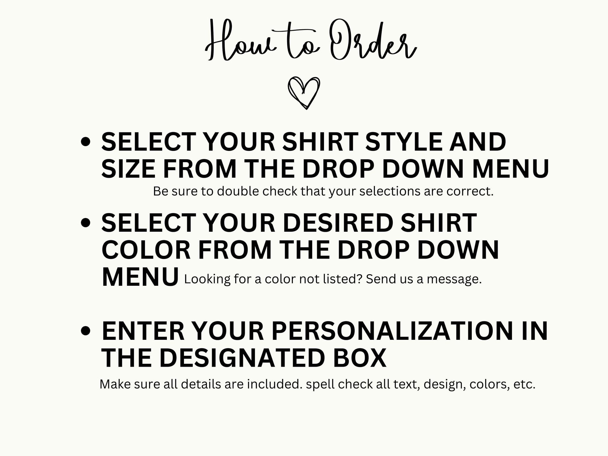 ◼️ Choose the SHIRT COLOR from the 2nd drop down (see color chart in pictures), we highly recommend reviewing these since every style runs different in the shop! Not all types of shirt/sizes come in all the same colors. So if you'd like youth and adult sizes, make sure to choose the same colors such as white, black or grey.