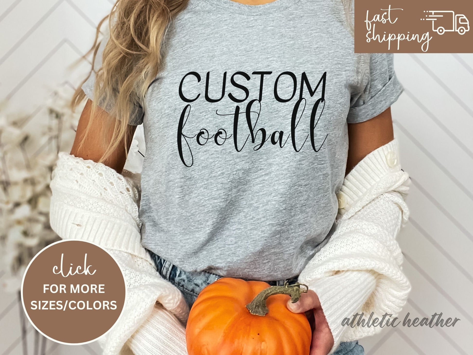 Customize this football shirt to meet your needs! Choose from short sleeve, long sleeve, hoodies, and crewneck sweatshirts and add your team/mascot and name/number! Other color options and styles are available. If you don't see what you're looking for send us a message!