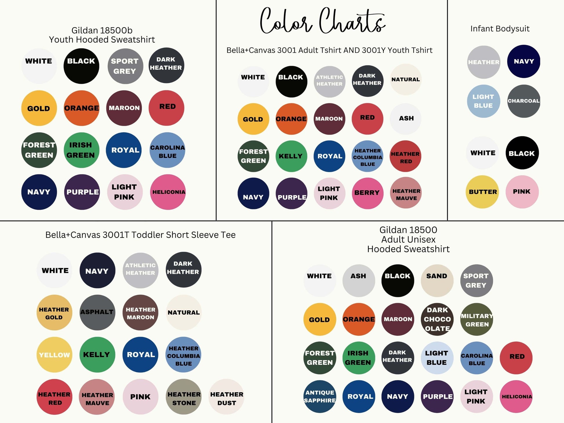 ◼️ Choose the SHIRT COLOR from the 2nd drop down (see color chart in pictures), we highly recommend reviewing these since every style runs different in the shop! Not all types of shirt/sizes come in all the same colors. So if you'd like youth and adult sizes, make sure to choose the same colors such as white, black or grey.