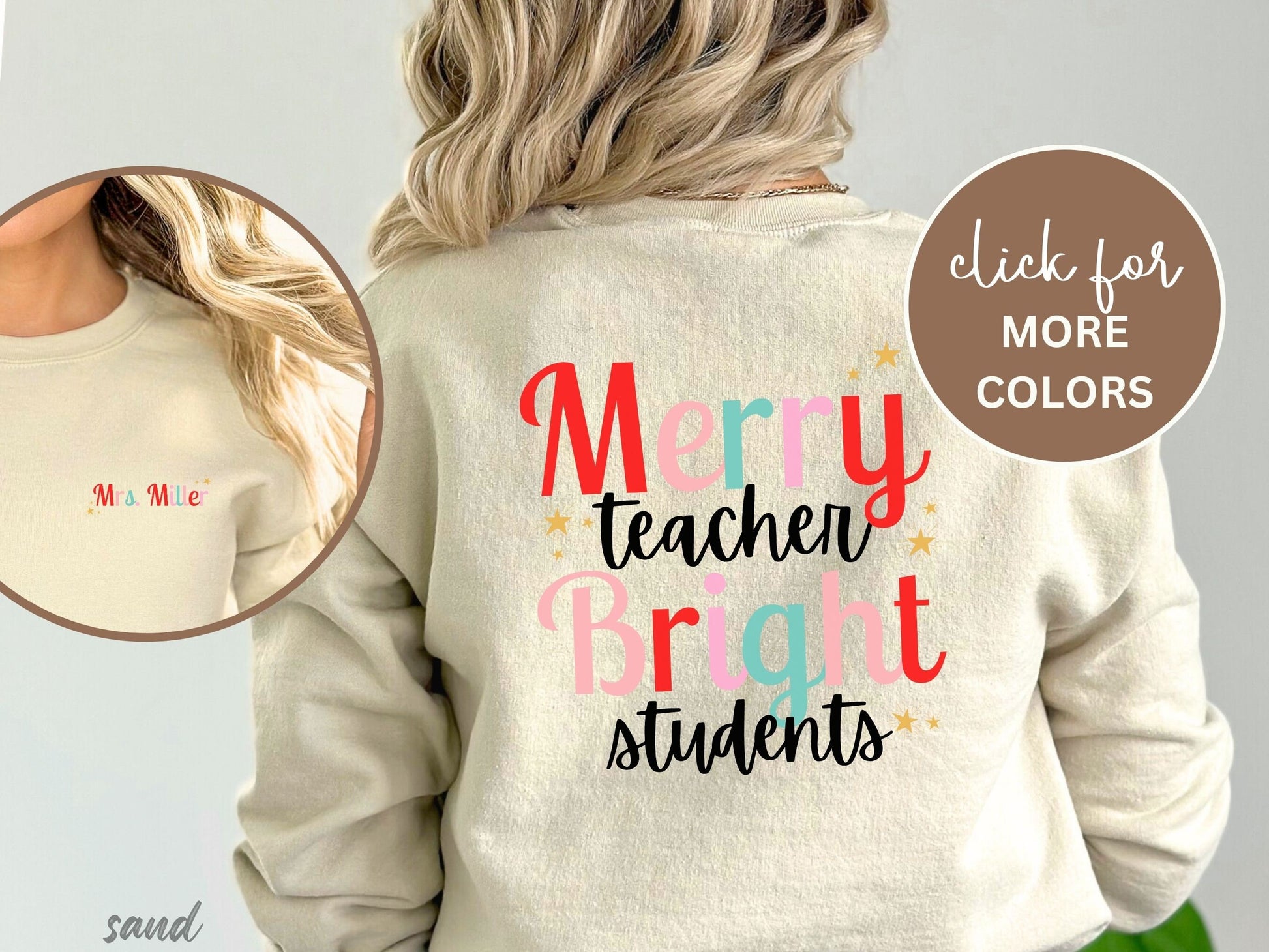 This Merry Teacher, Bright Students personalized custom sweatshirt is perfect for a teacher gift. Personalized the front with your teacher's name. They will love to have a personalized custom Chirstmas Sweatshirt or Tshirt.